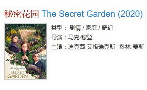 2020英国剧情片《秘密花园》,根据同名小说改编,豆瓣评分5.2,IMDb评分5.5,于2022年8月19日引进国内上映。