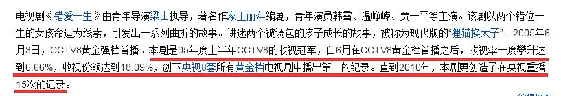 这部剧真的厉害了,在央8播出之后收视率一度到了6.66%,收视份额达到了18.09%,创下了当时央8所有播出电视剧的记录。就算到了2010年,这部剧被电视台拿出来重播的时候,还破了15次记录。《错爱一生》算是彻头彻尾的双女主剧,而韩雪饰演的角色非常容易让人产生好感,再加上这么高的收视率,真的不要太红啊: