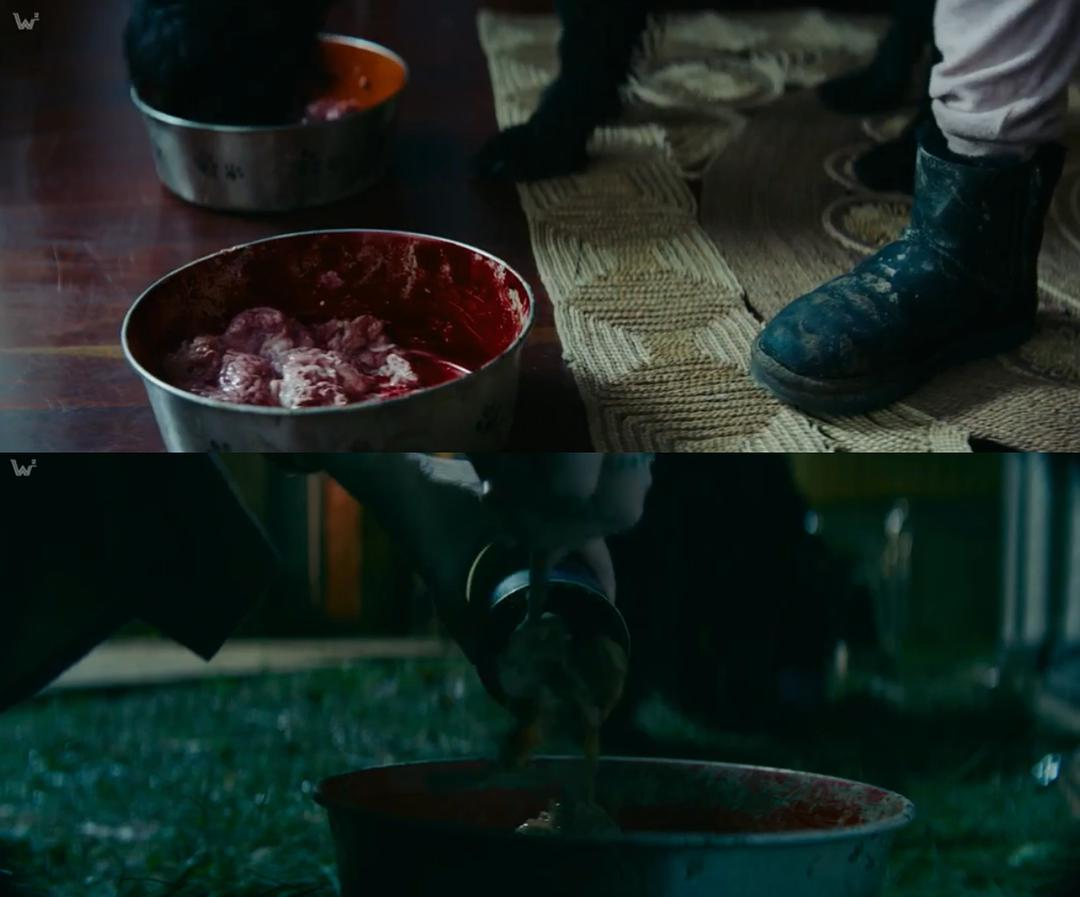 火车旅行结束,女主到家喂狗。可以看到装狗粮的盆子里有血红色,那不是女主幻想砍报亭男时,把脑花扔进盆里留下的吗?我想到三种解释,一:幻想砍报亭男前,她已经见过有血的盆,正好让她幻想到扔脑花进去的情节。不合理处:只见过他们喂速食狗粮,没见过喂带血的生肉。解释二:女主送报亭男去医院是假,砍死报亭男是真。不合理处:到这种犯罪程度不进监狱也该被关起来了吧。解释三:报亭男的真实性存疑。