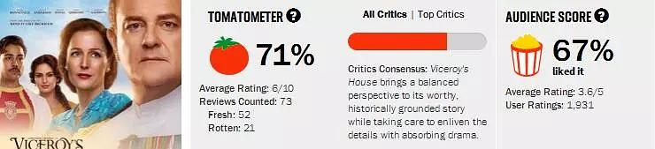 “历史是由胜利者写的,”在总督府的开头写道。这个故事并不是一个完全浮现在脑海中的想法,关于一个贬低和消失的英国帝国离开印度的分离计划。当然,英国人没有表现出羞辱的失败,因为他们在开幕式上站在仪式上,陶醉于英国直接统治的宏伟壮观,这里是新德里的一个巨大的豪宅,有数百名本土的印第安人,他们被囚禁英国官员周围,好像这是拉吉的高度。nn众多工作人员在主持国家独立和正在进行的分区谈判时,为印度最新和最后一位总督路易斯·蒙巴顿勋爵(Hugh Bonneville)的到来举行了全面仪式。影片将重点放在蒙巴顿的会议和谈判中,印度工人的来往必须在总督府(现在的Rashtrapati Bhawan)的广阔内部和同样拜占庭式的社会和宗教阶层中进行,这些阶层使他们劳动的看似一致性变得复杂化角色。随着国家紧张局势的加剧,这些差异变得越来越明显,造成厨师和男仆之间的分裂,使他们的西方监督者感到困惑和恐惧。nn然而,在大多数情况下,牵制印度的外部宗教斗争体现在两位仆人之间的罗密欧和朱丽叶叙事中,即印度教的Jeet(Manish Dayal)和穆斯林Aalia(Huma Querishi)。他们的恋情主要包括偷偷摸摸的目光和简短而紧张的谈话,从不升级为激情。n 因为Jeet和Aalia从来没有带着任何紧迫感聚集在一起,所以当印度的分裂威胁要将它们撕裂时,它们不会产生任何悬念或悲剧。nnn事实上,蒙巴顿比电影的印度人物更加阴影。邦纳维尔将总督描绘为一个富豪而自由主义的人,由于英国人不再控制这个国家,他们代表了对印度文化迟来的兴趣。然而,蒙巴顿平静的好奇只会进一步标志着他作为一个局外人,因为这个国家在总督府的维持秩序之外崩溃了,他对有序过渡的无能为力只会让他对他的同事和印第安人都是天真的。nn蒙巴顿的无用为Viceroy's House提供了根植于殖民主义的自由主义空洞细节的潜在主题,但这部电影采取了一种奇怪的叙事转变,使得该官员本身成为英国计划的受害者。正如剧本(Paul Mayeda Berges,Moira Buffini和Chada)所说的那样,Mountbatten关于更温和,更和平的分区的想法被丘吉尔的阴谋愚弄,他设计了一个计划,将未来的巴基斯坦国家用作缓冲区反对苏联。nnn在这里提供的历史版本中,蒙巴顿和他的助手只不过是伊斯梅勋爵(迈克尔·甘本)的典当,他是一位专横的贵族,他无情地无视总督关于如何划分国家的委托研究,而是绘制了一个最有利于边界的边界。nnn皇冠。蒙巴顿只是让丘吉尔转移了对该计划的责任,该计划重新定位了帝国操纵的最后一击不是在印度周围而是在总督的影响。这有效地摒弃了蒙巴顿不幸的愚蠢行为本能,完全不熟悉他暂时统治的地区的地理和文化,这与电影最初的,更为尖锐的方程式相差甚远,这个方程式与男人的善意和遗忘有关。nnn影片中唯一能够抵消这种自我否定的修正主义的是涉及总督夫人埃德温娜·蒙巴顿夫人(吉莉安安德森饰)的场景。Edwina放大了她丈夫的自由化倾向,带着光顾的微笑和指示将更多的印度文化融入豪宅,并邀请更多的本土客人参加官方活动,到达总督家。她甚至在现场开枪监督公开种族主义。她认为这项改革是一种尊重的姿态,但是仆人们只把它视为一种秩序,而这部电影的最佳场景让Edwina坚持不懈地反对他们的私人投诉。例如,当她告诉厨师做更多的印度菜时,他只能抱怨他一生都要训练西餐,现在才被告知做别的事情。nn安德森将Edwina描绘为真诚和聪明,但仍然能够看起来很愚蠢,带着副手的实践面容,只能加强她从房子墙壁后面体验“真正的”印度的想法的荒谬。Edwina比她的丈夫更渴望得到污垢并与人们见面,它提供了电影最有见地的一瞥改革和尊重的终极限制,在这种制度下,一个国家可以决定另一个国家的政策甚至边界。nn