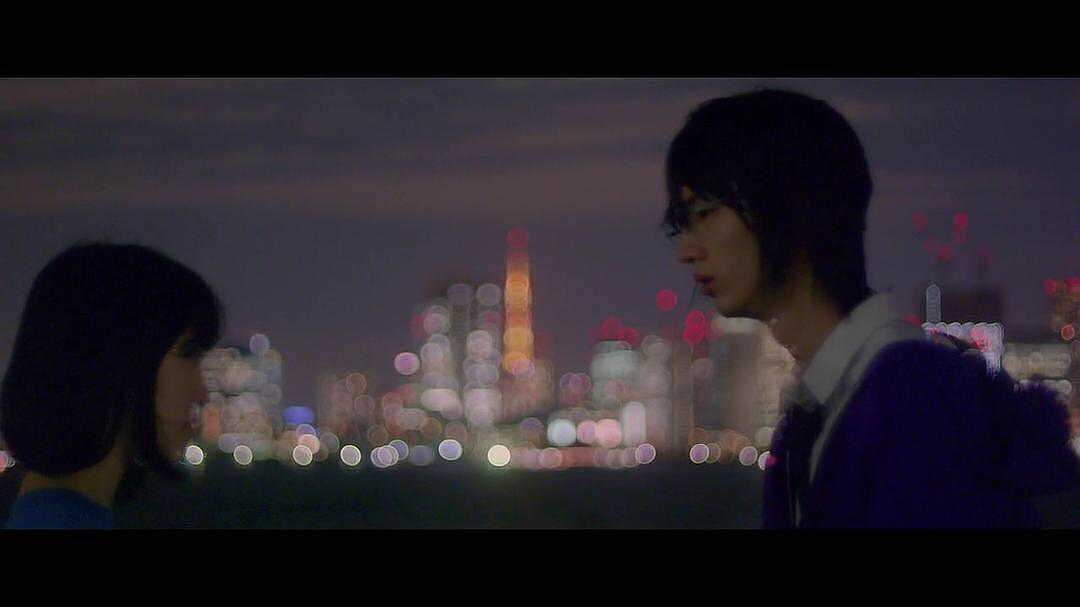 和别的导演把媒介纯粹作为中介来运用的视角有些不同。山户结希对媒介的处理的非常巧妙,比如电影里有一场成田初与小田切梓视频通话的戏。她从两人拿着手机对话的普通镜头开始;随着谈话的内容变得私密,直接在大银幕上用相应的画幅(余下留黑)展示出了两个人的手机视频通话界面,在两个界面的来回切换中消除了手机界面的中介性;这之后她的做法更为大胆,将镜头切回了两个人实处的空间——床,但却让一个角色处在仰卧位置,而另一个角色在俯卧位置,通过密集的镜头切换将两个空间的距离感消弭。最后给观众的观感就好像是看了一场性爱戏一般,展现出了非常细微(符合青春期性幻想程度)但强烈的情色感。叙事层面,我认为山户结希对中介性的抹除体现出了她对网络时代爱情的敏锐。在流行话语里,当代年轻人们花在手机以及各种数字媒体上的时间已经到了影响他们生活的地步,而这其中最让人注目,甚至让年轻人们都产生自我怀疑的,就是爱情的虚拟化。在保守的人眼里,通过影像或者文字而产生的爱情根本不算什么情感。但山户结希则带有一种更为民主的观念,爱就是爱,是不会因为任何中介而变质的,纯粹的情感联结。这不仅抹消了媒体(电子媒体、空间媒体、声音媒体)之间的层级关系;更重要的则是,通过界面拟像、音声与空间三个层面去除中介性后对情感的直接展现,山户结希呈现出了情感对这些“技术”的“反抗”以及“掌控”能力,即主体的能动性。而我作为观众,面对这样缺失了中间感的影像,也收获了一种前所未有的共情体感。我们谨记山户结希对中介的态度,再结合“风景”来看她对都市空间与人的设计,就很自然的可以感受到她的意图。从一开始的成田初的人物像不断被重复的都市景观吞没:或摇摆于豊洲的高楼之间,或消失于嘈杂的涉谷街头——并置了缺乏主体性的女主与缺乏安全感,充满不确定性的都市生活。用“风景”的逻辑阐释,可以说对自己缺乏认知,缺乏动力的年轻主体在不断被重建、不断被翻新的都市景观下是一种被动的再现关系。但随着女主在感情中不断成长,不断确立自己的主体性,都市景观也变得鲜活而可控了起来(最直接的体现就是镜头不再那么晃动)。在女主与橘亮辉互表心意,确定恋爱关系那一幕的最后,焦点先是从两人移至背景的都心景观,再回落至夜色下两人贴合在一起的剪影,相互亲吻的少女少年们缠绕的线条勾勒出了一颗爱心,包裹住了背景的高楼。这是山户结希对空间以及人物情感处理决定性的一刻。终于,不再是空间对人物施以暴行,而是情感包容了空间,年轻的“我们”掌握了世界。如果我们把山户结希的对空间的刻画与这个特殊的时间点——后311到2020前的这段三明治时间——联系起来,无疑可以发散更多的想象力:为什么开场就用挂着2020奥运会的标语的车站场景?新都市,新未来是什么?这个未来属于谁?因为国家项目而被不断重建的城市空间与充满不安与焦虑的年轻人之间的关系该怎么理解?最后成田初对于变化的坦然接受与勇敢面对又传递出了山户结希的什么看法?这里仅供抛砖引玉,不过多赘述。但笔者认为出身哲学系,有着极强作者意识的山户结希的影像值得更多细节上的讨论。