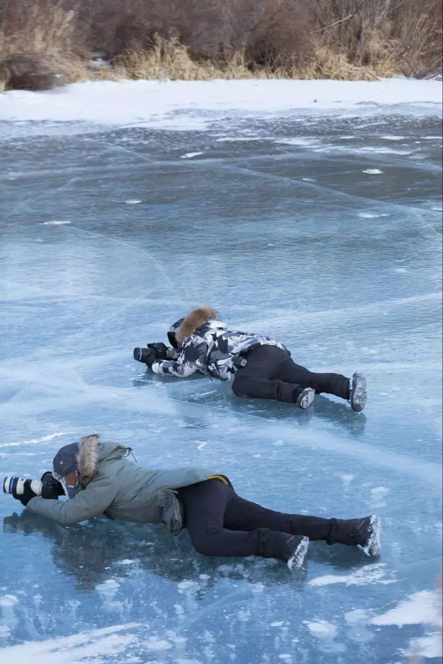 为了更方便工作,摄像师趴在冰上拍摄