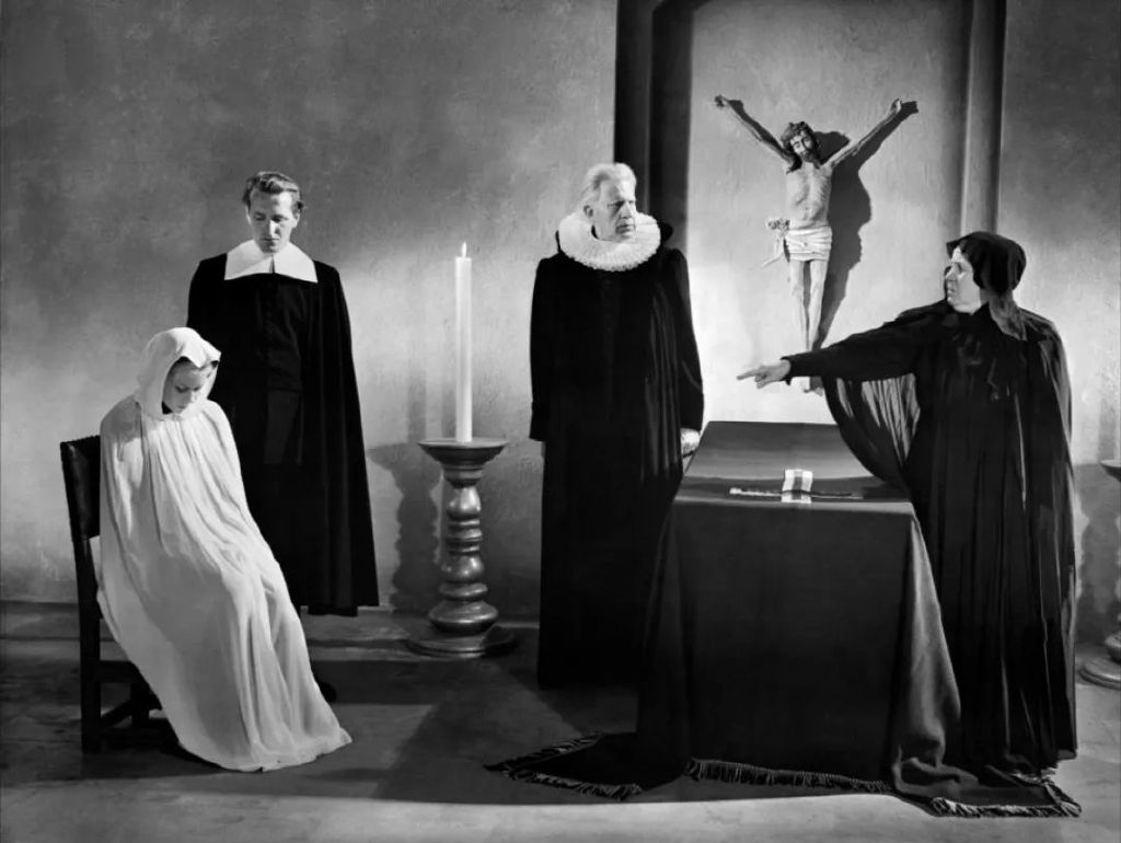 这里当然隐约回扣启发本片的两大源头,一是克里斯坦森的《女巫》,一是德莱叶的《复仇之日》,片中引用的旧作基本从这两部片取材。在克里斯坦森这部可以归类到纪录片的默片作品中,以最后一段将时间背景拉回现代(影片发行的1916年前后),以精神病征(癔病,百度百科按:一般指分离性障碍。分离性障碍又称分离/转换障碍,曾称癔症或歇斯底里症)来讨论当年被视为女巫并且遭受到各种酷刑、折磨的女性,很可能根本是在病征下被迫害、被虐待、被残杀的病患。至于德莱叶那部,很可能受到他的同侪(即克里斯坦森)的影响,一方面节约了在《女巫》中以影像图解各种书籍中对女巫的描写部分,在影像的风格上也有相承(早在如《审判长》、《一家之主》或有名的《圣女贞德蒙难记》中都能看出德莱叶受到克里斯坦森的影响),更重要在补足了女巫们的“人性”与情感。碧翠丝眼见她的作品以及更重要的是为她付出的女演员们正在遭受残害与破坏,因此陷入焦虑;而台上的夏洛特也被闪烁的光线以及对女儿是否受到严重伤害的担忧,逼出她的激动,但她越是挣扎、愤怒、求饶,在摄影机后头的摄影指导/补位导演马克斯则越亢奋,这时还顺带引用了法斯宾德的言论:“当压力太大的时候,我就会转变成一位独裁者”来比喻马克斯的状态(或许也指涉碧翠丝的状况)。