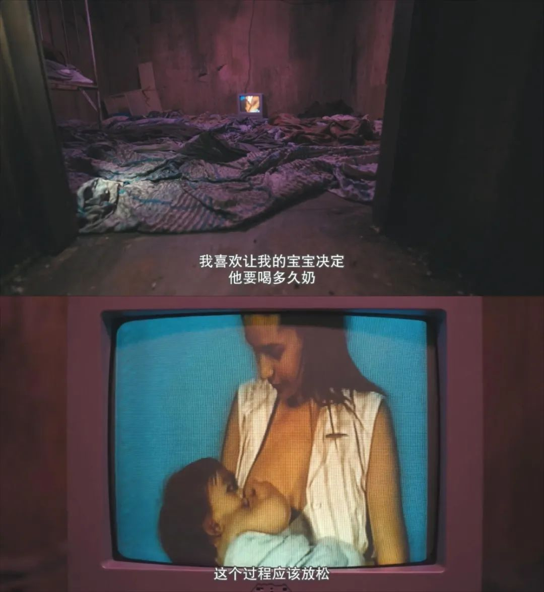 那么,早已成魔的野蛮人,就更是凶悍。她作为被长期腐蚀的牺牲品,成长于根本没有爱的环境,却从反复放映哺乳教程的电视中「感染」了所谓母爱,对于照顾「宝宝」产生极其强烈的绝对欲望。讽刺的是,她圈养猎物喂奶的行为模式,照搬了自身囚徒的成长背景,毕竟那是她唯一熟悉的交际。