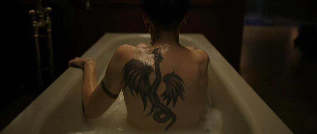 电影开始用莉丝沙兰德惩罚了家暴妻子的丈夫的场景,大致表明了这个痛恨家暴,主持正义的黑客的形象。而女主与妹妹下国际象棋的一幕则是莉丝的回忆,带出他们的父亲想非礼她们的一幕,女主更为叛逆,无法忍受,跳下悬崖,而女主妹妹则坚决留在父亲身边。