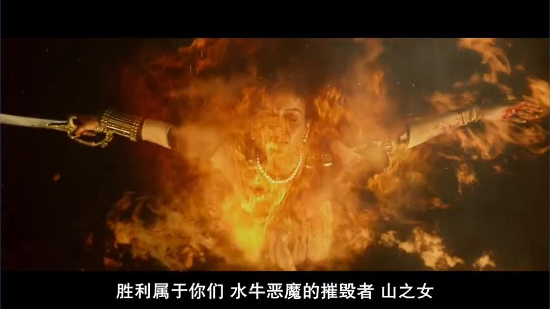 4、历史上女王本是战场上伤重不治身亡,剧中改为伤重不愿被俘,蹈火而逝。这本是印度寡妇自尽的礼仪,暗示女王以身许国,战败国亡则身亦随逝。