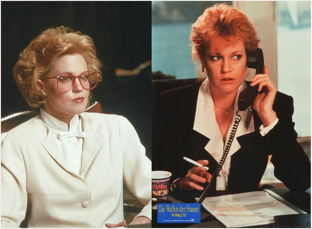 1988年的[上班女郎],女性角色无一例外不是这种装束。与男人针锋相对时,气场瞬时欺压上来。