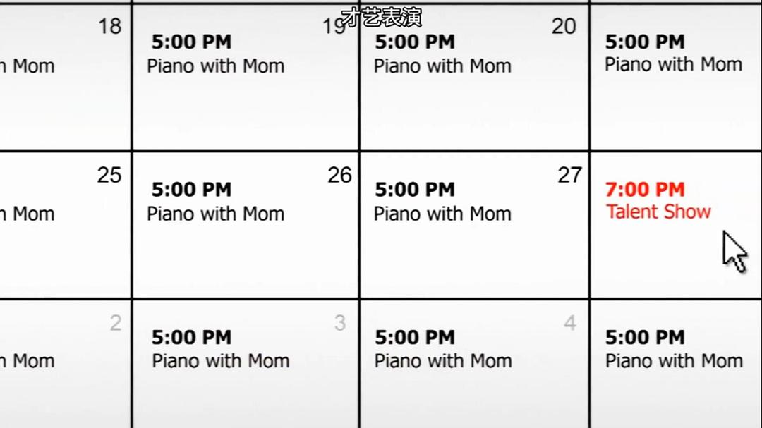 在快闪而过的日程表中,我们看到,所有学习钢琴的时间都备注这Piano with Mom。可见Margot每次钢琴课都有妈妈的陪伴。而妈妈临终前的视频中也看到Margot为妈妈弹奏曲子。