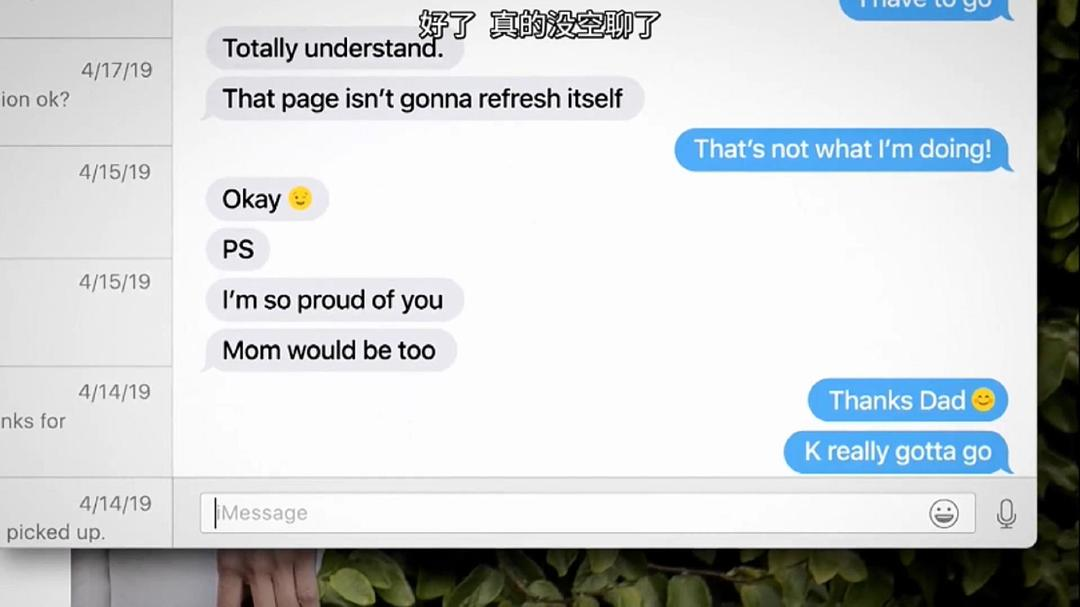 这一线索贯穿始终。在影片第一段父女的聊天对话中,David本欲发送一段Mom would be too. 却又删除了。而影片最后,经过了一切,这句话终于送出,父女之间终于打开了心结。
