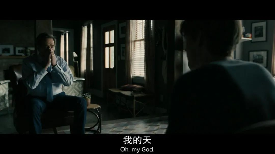 当他得知这一事实的时候,我们看到他对死者深切的愧疚和同情。但是值得注意的是Cranston的演绎方式。他始终使用了一种非常轻盈的声音和动作,这可以理解为法官的温柔性情与对他人的极端尊重。但这无疑也是一种有意为之的形象塑造。在沉重的事件面前,一个人既能展现充分的同情,又能克制不失仪,未免太完美,这种完美会令人感到疑虑。而且当法官的形象呈现后续的裂变和翻转之时,之前给观众的印象越是美好,之后就越会令人清醒、冷感,从共情的情绪中抽离,变成审视。