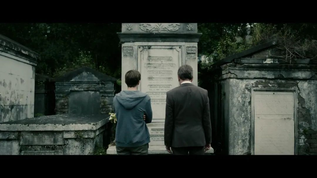 主人公进入一片墓区,靠坐在其中一座墓碑之前。而平行出现的另一个镜头是少年从书桌上捧起一个中年女性的照片,神色哀伤。我们很容易就能联想到镜头试图暗示的信息:这是一对父子,照片中的女人是分别是他们的妻子和母亲,而且女人已经去世。