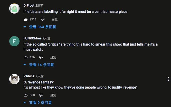 剧集开播不久,Jack Carr 上了塔克·卡森的节目,两个人群嘲了左翼主流媒体对本剧集的批评,所谓的“精神错乱之右翼分子的复仇幻想”。两位在节目中的表现,以及观众的反馈,可以参看下面几张截图。