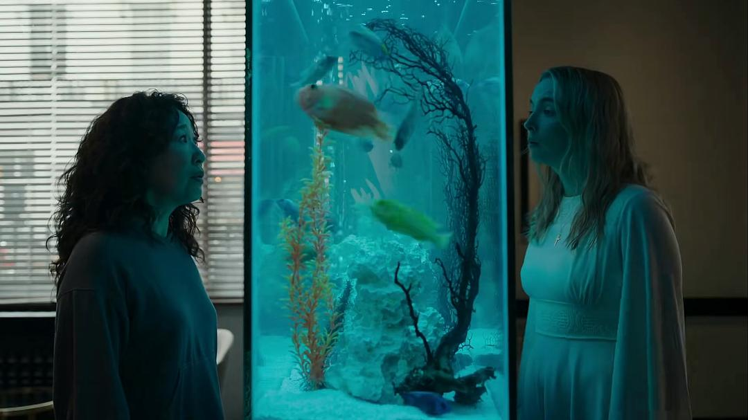 n(关于“鱼”和“水”象征义的一点补充,大家可以自行阅读理解:nn⑴在基督教中,鱼是丰富和信仰的象征,如圣经中关于鱼类和面包的故事中所观察到的。基督和他的门徒也是“人类的渔民”,也有一些圣经的参考文献。在这里,人类被描绘为变形鱼,海洋是人类发现自己的罪恶深渊的象征。异教传统认为鱼是生育的女性象征,是女神的一种属性。水是神圣母亲校长流动的天然象征,因此,水中的所有生物(包括鱼类)都是女神的生育力和力量的一部分。作为一种古老的凯尔特人象征,鱼(象鲑鱼)的象征意义涉及知识,智慧,灵感和预言。古代凯尔特人相信鲑鱼从知识井(Segais)消费神圣的榛子中获得了智慧。此外,他们相信吃鲑鱼也意味着获得井的智慧。nn⑵在古代东印度神话中,鱼是变形和创造的象征。这在古代洪水神话中被观察到,在这个神话中,毗湿奴将自己变成了一条鱼(Matsya)以拯救世界免受大洪水的侵袭。在这种形式下,他指导国王马努的船(其中包含少数幸存者和生命的种子,以便在洪水消退后重建世界)到安全。nn⑶古代非洲创造神话告诉创造者曼加拉,在宇宙子宫中种植种子。从这些种子中,两条鱼爆发,并在创造的水域中被放入宇宙中。我们从这个神话中看到鱼的象征意义,通过体现初始生命的新阶段,再次涉及生育和创造力。(点击此处查看其他双胞胎符号)。nn⑷在中国,鱼是统一和忠诚的象征,因为人们注意到鱼(特别是锦鲤鱼)经常成对游泳。考虑到这一点,鱼通常以魅力或小雕像的形式作为结婚礼物赠送给新婚夫妇一个忠诚和完美结合的吉祥标志。由于它们在速度和体积方面的繁殖能力,它们也代表了生育能力和丰富程度。nn⑸最后,在挪威和古代欧洲文化中,鱼具有适应性,决心和生命流动的象征意义。通过这些培养物观察到鱼类在野外经常表现出很大的适应性,并且它们自身采用了这些特征。三文鱼在他们每年朝向产卵场的朝圣之旅中一般都受到尊敬 - 整个旅程都是逆流而行。nn——这样看来,Villanelle作为“一条鱼”,和那只黑猫之间的敌意是不是就能得到解释了?「失手杀猫要放在下一集详细讲」)