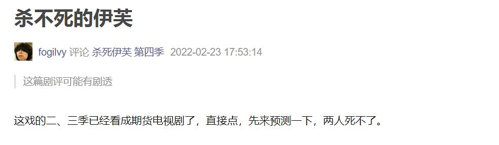 跟前两季一样,本文从属于S4评论总汇贴:杀不死的伊芙,想看单集评论的看单集,想看逐集总汇的看前面的链接,请随意。