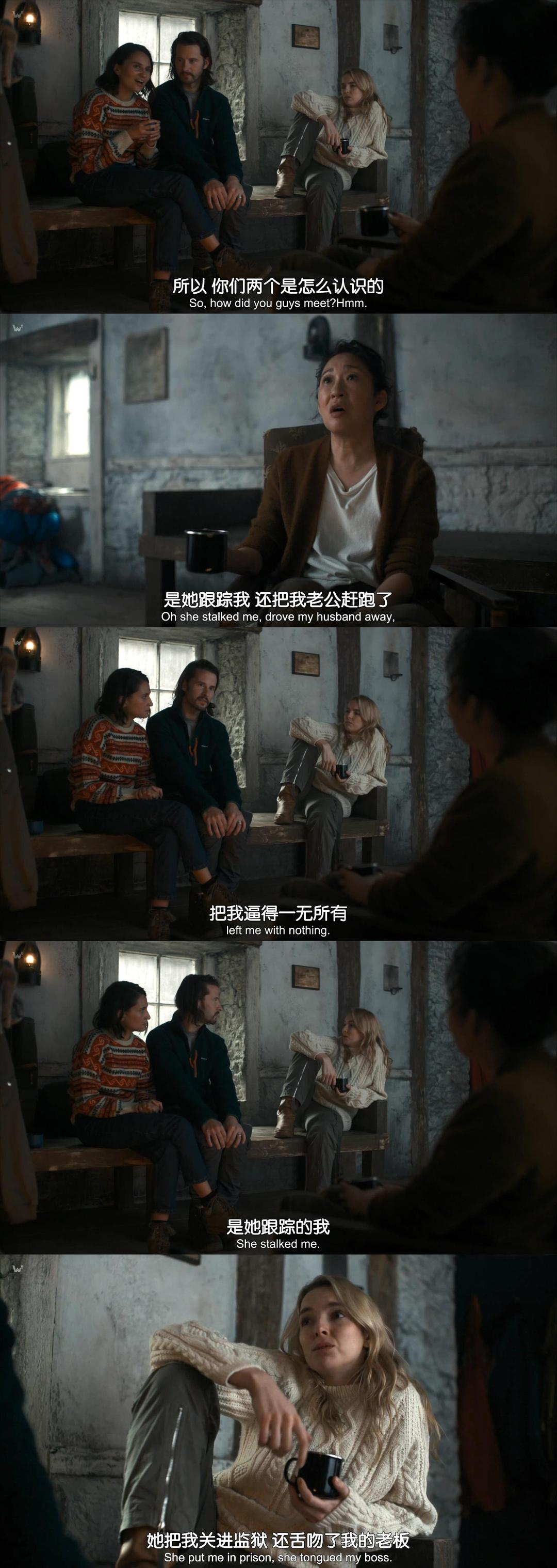 n“两点的时候,你要去沙雕比赛做评委。”nSorry啊,我真的会笑。n至于Carolyn突然转变的服装风格,我想起Fiona Shaw曾经在访谈里和主持人交流过,Carolyn的服饰令人感受到一种“性吸引力和权力”,且因为需要辗转世界各地,她总是穿件外套,还有,她本来总是拎手提包,后来因为越来越忙碌,干脆包都没了。n——额,如今,她直接换休闲裙装。一些被流放的闲人状态跃然屏上。nn“人类,接受不了太多的真相。”n——至于C为什么引用艾略特,我搜索了一下原句,发现它出自艾略特的《凶杀案》。这部小说的一位读者写,艾略特所有剧作的主题都与“对超验世界的恐惧”有关,ta的读后感中还有这样一段文字:n“——对超验世界的恐惧,集中体现于合唱队(即自然界的人)。她们是最普通的民众,是社会最底层的基本构成,她们的信条是“活着,凑凑合合的生存着。”当托马斯死后,合唱队如是唱道:n“与对人的不公正的畏惧相比,n我们更加害怕上帝的公正。n我们害怕窗外的手,茅草屋顶上的一把火,n小酒馆里的拳头,运河边的推搡,n但我们更加惧怕上帝的垂爱。n我们承认我们曾非法侵入,我们软弱,我们失误;n我们承认我们承袭着世界的罪恶;n殉道者的血、圣徒的痛苦里,也都有我们的罪过。”n无论是上帝的垂爱,上帝的公正,人都难以接受。这种对超验的恐惧,以向上帝求取怜悯的方式,被人无数次的表达着。”n(附上原文链接,整体阅读可能对各位的理解会有一些帮助:https://mbd.baidu.com/ma/s/VbOUBtj3)