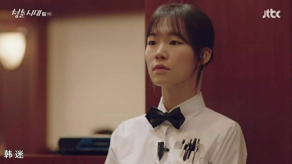 每次看着她,我总会感到心灵啜泣的疼痛。青春不该是这般模样的;即便是青春的尾巴,也不应该如此窘迫、凄惨、和狼狈。那种哀伤到独自倾吞的苦闷酸涩,似乎没有终结的一刻。她、她母亲、她弟弟,所有人都被围困着。她的弟弟被生与死隔绝着;她的母亲被希望和绝望挤压着;她则被平凡以下压制着。生活对她,仅仅只是坚持;连平凡的呼吸都算不上,更谈不上享受人生了。那么用力地推开爱自己的人,那是该有多痛;面对流言、嘲讽、和作弄,她不解释、不叫苦、不喊累、不抱怨、不撒娇、不依靠、不颓丧。。。她的腰板总是挺得很直(韩艺璃作为舞蹈专业的毕业生,站姿可见一斑);即便她手臂上枕着三大盘又热又重的餐盘,她的目光永远直视前方,她的步伐永远端丽; 她端菜上菜的姿态总是不卑不亢,即使是帮助客人捡起掉在地上的叉子都是那么从容有礼。对于客人,她从没有刻意讨好、也没有虚应奉承、更没有评头论足。客人的失误,她有礼适宜的进退不会让客人觉得尴尬丢脸,先给客人新的布巾和刀叉以方便客人继续用餐。她自己的人生有太多的疲惫,但是面对客人她从未显露过自己的难处。即便只是打工的餐馆,她的工作态度和能力依然是无可挑剔的完美。第一集里我就注意到尹前辈在餐厅上班时,她白色衬衣的左胸口袋里并排地别了很多支笔,对比其他员工时显得格外唐突。是为了时尚吗?不,是为了方便给客人签账单时使用,像别针一样地别了那么多支是为了有备无患。