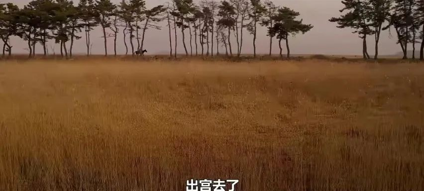 再来看看有关女主的镜头,她骑着马出场。又是一个鸟瞰镜头,以小路为分界线,整个画面大致上一分为二,右边的绿色树林尤为显眼,有眼前一亮、生机勃勃的感觉,而左边则是暗暗的、土黄色,应该是芦苇和湖水,两边形成了非常鲜明的对比,代表了什么?