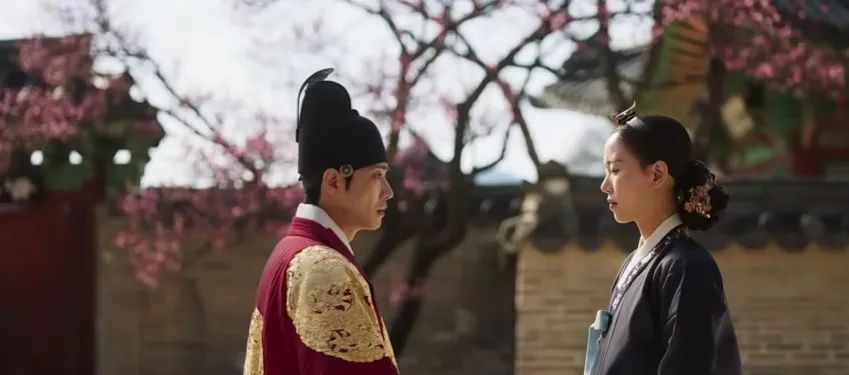 现在与过去的场景都有花。但过去是青葱的树木、粉嫩的樱花,两人服装皆为浅色,显得年轻和纯粹,左相一袭白衣干净清爽,大妃宛如少女。