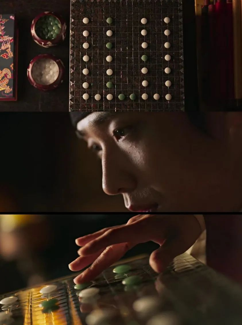 如果只是让两人在惊愕中相认,似乎还不够力度。导演将男女主相认与左相下棋的两条线交叉剪辑,在这场博弈中仿佛左相就是“导演”,王是他手中的白棋,他是黑棋,他已经看透、料到了王下一步要走到哪里,而他早有大招等在后面。