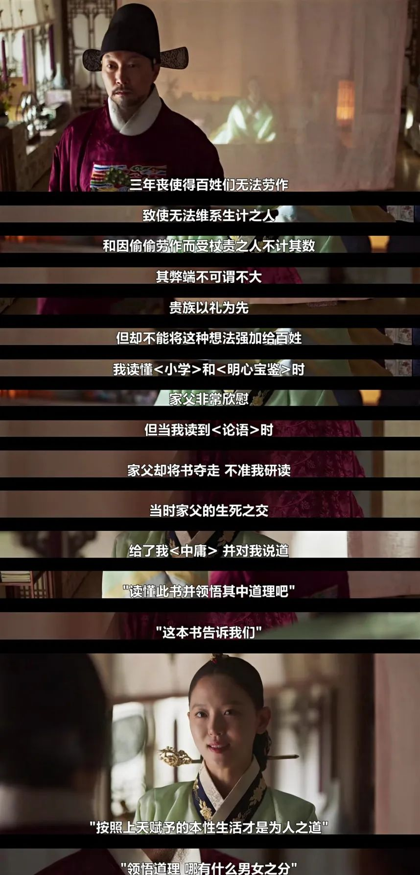 与大妃不同,刘贞是被赋予圣君品质的女子,不仅借左相之口多次说刘贞有将相之才,下面这段与士林元老相认的戏码再次证实了这点,刘贞是有思想根基的,饱读《小学》、《明心宝鉴》、《论语》、《中庸》这些经书,而且领悟道理不分男女。