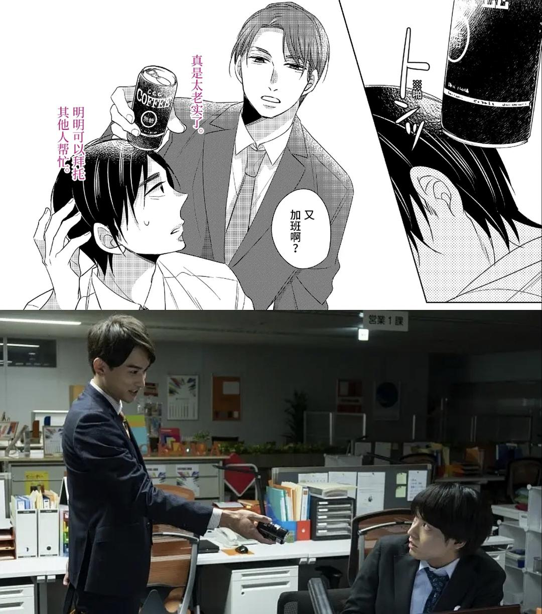 换座位:漫画里黑泽是在去温泉旅行的大巴上和六角换座位的,理由是“我邻座的女孩子好像对六角你有意思”(其实女生表现得很明显,她喜欢黑泽);剧中则是在聚餐时,由于聚餐原因是六角签成了第一单,黑泽便顺势让六角替自己去送一送提前离席的课长。漫画有点不尊重女孩子,而且有玩弄六角感情的嫌疑;剧中的理由很自然,而且让业务逐渐上路的后辈在领导面前有更多表现的机会,黑泽的形象更加正面(当然也再次说明温泉之旅应该是真的真的没有了)。