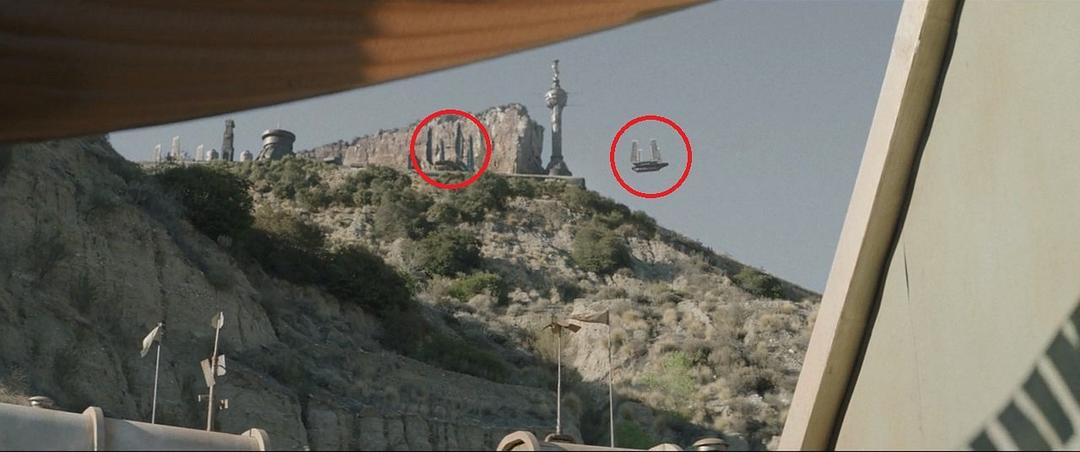 这是塔图因城市莫斯艾斯利(Mos Eisley),最早出现在1977年第一部《星球大战》电影里。在城市远景里可以依稀辨认出两座地标性建筑:乌布里基亚贸易大楼(Ubrikkian Trade Tower)和“王太后号”(Dowager Queen)。前者是乌布里基亚运输公司在塔图因的总部所在地;后者是一艘赫特人殖民飞船的残骸。“王太后号”在塔图因坠毁后,殖民者围绕它的残骸建造了莫斯艾斯利这座城市。