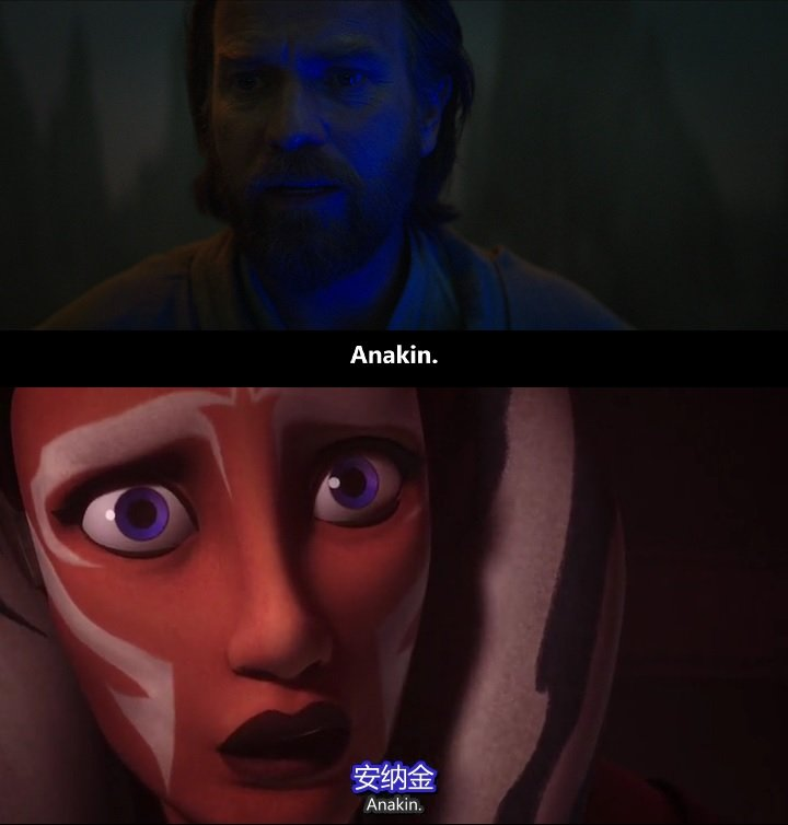 欧比-旺和阿索卡看到维德破碎头盔下的半边真容后,都叫出了“Anakin”。