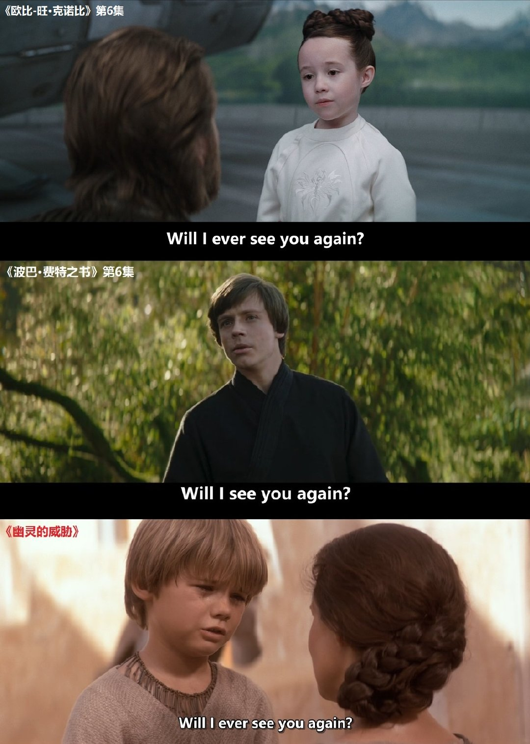 欧比-旺含泪对达斯·维德说:“看来我的朋友真的死了。”十三年后,卢克也对达斯·维德说了类似的话:“看来我的父亲真的死了。”