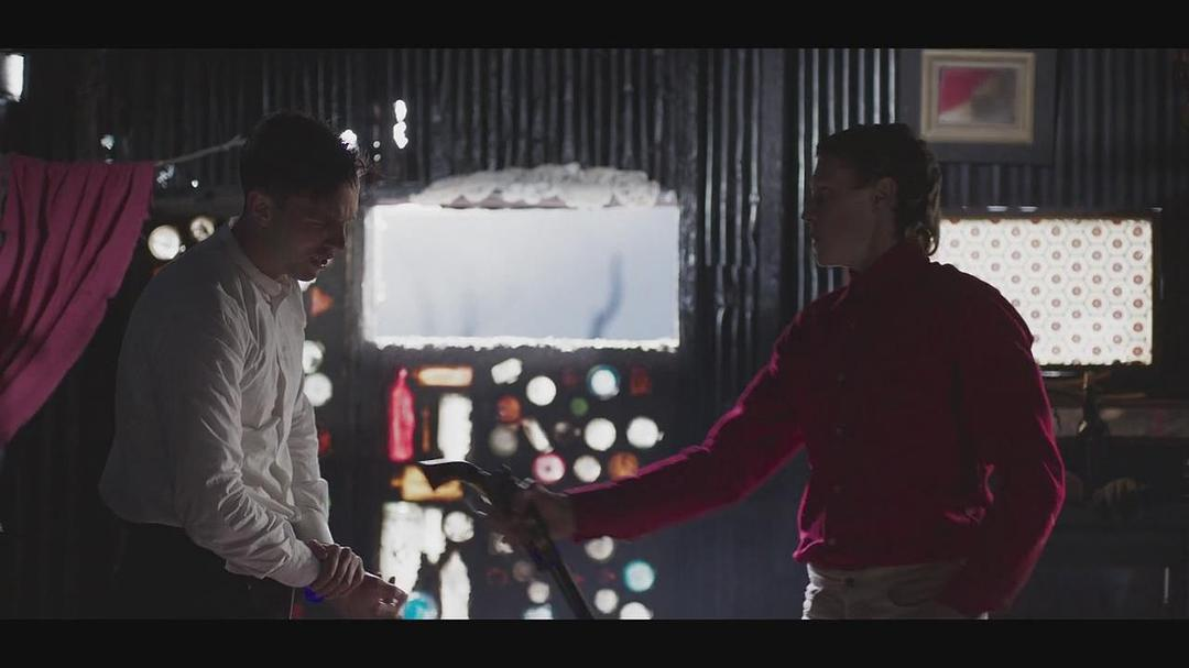 这一场妓院的戏份里,乔治麦凯和尼古拉斯霍尔特分别在不同的场景下贡献了自己的裸体演出。与裸体的Ned Kelly面对他未来孩子的母亲Mary时表现的拘谨与不习惯形成鲜明对比的,是裸体的Alexander Fitzpatrick面对Ned的随意和放松,连Ned在这场戏中也放松多了。Ned显然是更习惯与男人亲近,而不是女人。这一段其实就是导演Kurzel在“探索同性元素”或者说“打基情牌”。主角的宿敌和被凝视的欲望的客体是一个人,这也不算太少见,比较少见的是:被凝视的客体也是个男人。必须高亮一下这场戏的霍尔特对乔治麦凯说的金句:你穿着裙子干过吗?