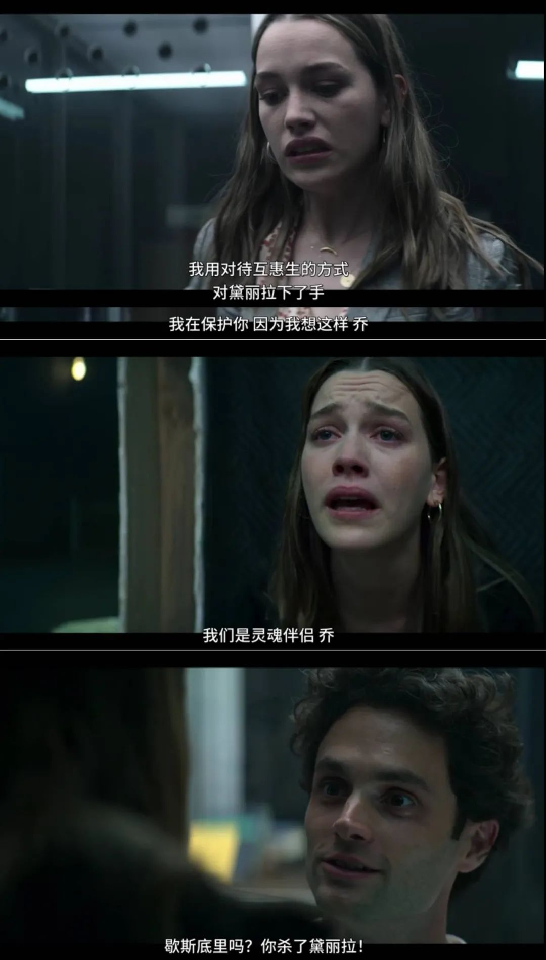 Joe每次的犯罪都可以说是因为爱,可是他真的懂爱吗?从Beck到Love再到Marienne,他沉迷于某种被他称之为"YOU"的pattern,沉迷于英雄救美的故事,沉迷于他自己对于一段亲密关系充满掌控的样子,甚至是他对于Henry的爱,会不会或多或少是把自己童年的影子投射在Henry身上了呢?不敢否定Joe真的爱过他人,也不敢妄下定论Joe一定只爱自己,但至少Joe的爱是自私的。这部剧里的另外几个角色也是自私的,Theo就是打着真爱旗帜破坏别人家庭的selfish teenage asshole(可能因为年轻,就真爱至上吧),Ryan更是无恶不作、把前任视为自己所有物肆意践踏折磨的自私猥琐普信男(实在想不出有什么词可以骂他了)。第一集就领便当的Natalie就更不用说了,即使她只是想给自认为无聊的婚姻找点乐子,但对比她丈夫在她死后疯狂的想要找出杀人凶手、喝得烂醉翻看着他们俩的结婚相册怀念着她的样子,真的觉得她在婚姻中更关心自我感受。只是Joe伪装得更好。浪漫体贴文艺男青年的人设真的很难被拒绝吧。但是又如第一季里面Beck书里写的那样,But the stories were in you, deep as poison. Joe何尝不是自己在为自己编写这些故事呢?Deep as poison.