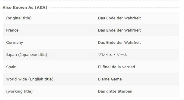 本片德文原片叫做《Das Ende der Wahrheit》,意思是“真理的终结”。这个片名就像影片里的特工一样实在,不整那些虚头巴脑忽悠观众的名字,就是和剧情息息相关。英文片名《Blame Game》是推卸责任的游戏,也和剧情大差不差,西文、法文、日文的片名也都是这个意思。