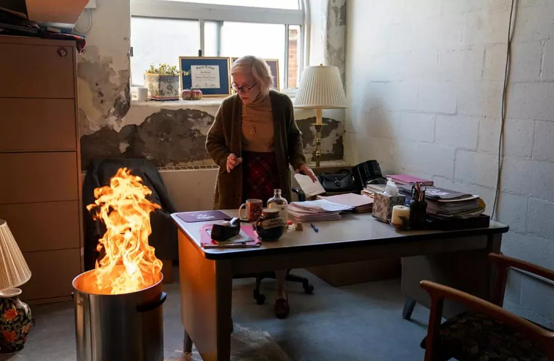 《英文系主任》剧照,焚烧学生评价的女教授Joan。