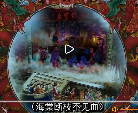 这一段给我的感觉太像红楼梦的判词了,海棠=三个主角,断枝=观音的断手=棠真的断腿(还捎上段忠义两兄弟?),至于见血不见血嘛,大概是点题,其实重点是这个图片里的内容,罪人,过桥,上岸,地府,往生