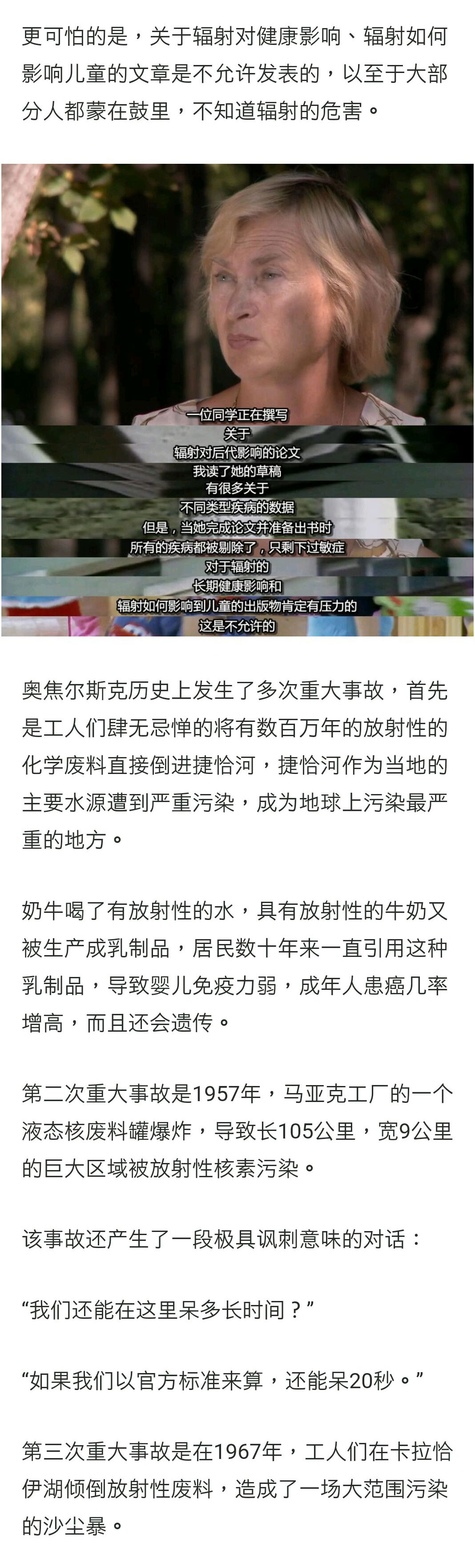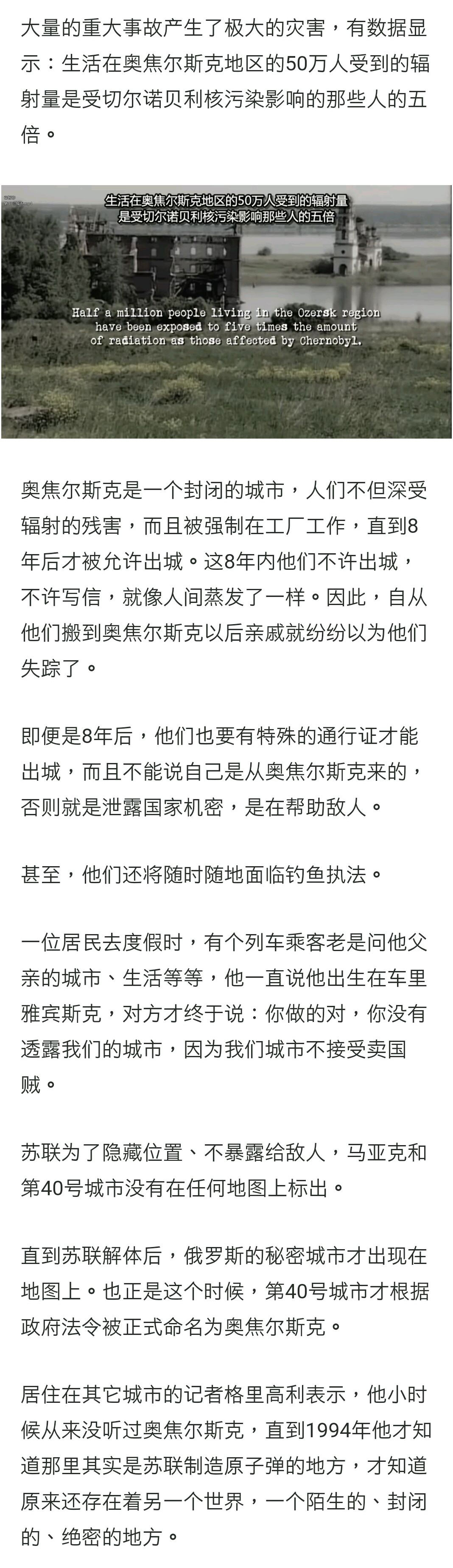 切尔诺贝利事故被称为历史上最严重的核电事故,但第40号城市比切尔诺贝利更恐怖,当地50万人受到的辐射量是受切尔诺贝利核污染影响的那些人的五倍。