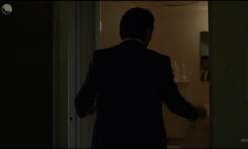 与此同时,洗浴间的门缓缓打开,镜子上映出半个女人的后脑勺,同时响起了淋浴的声音。n