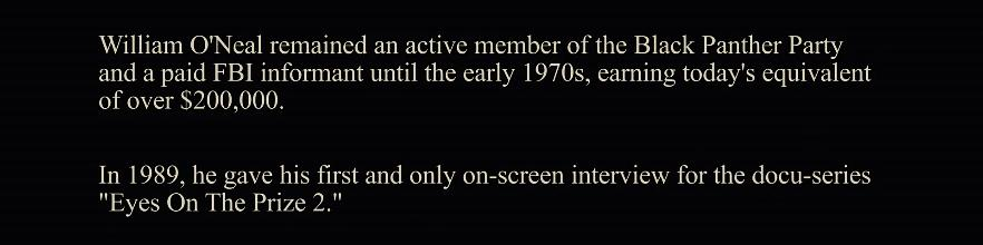 尽管他的叔叔声称他对与联邦调查局合作“充满负罪感”,但威廉·奥尼尔在几次采访中声称他对黑豹党“没有忠诚”。
