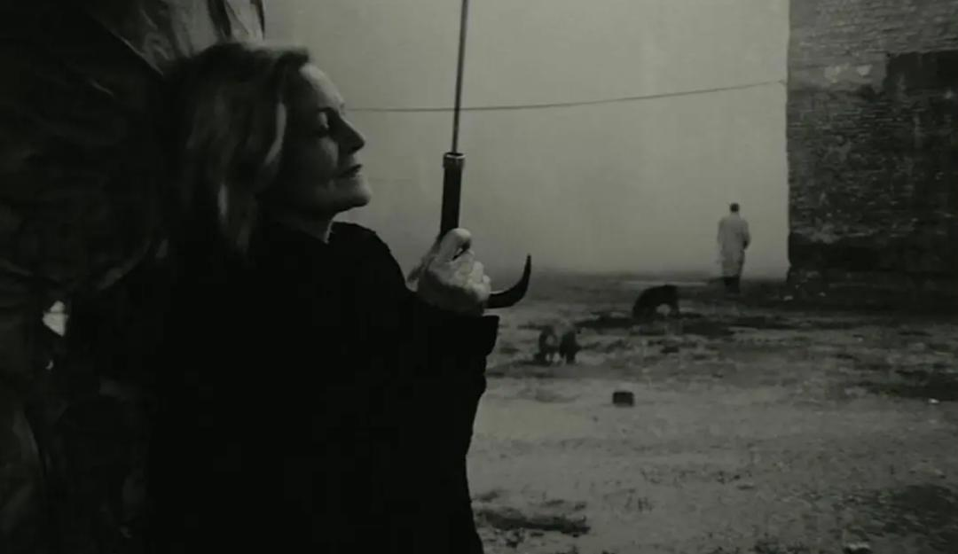 所以当褪去了符号意义的影像直接作用于感官,贝拉·塔尔进一步通过语义上的重复,在时间维度更广角地将影像中的可见的物敞开为可感的物。其中最为直观的是词语和影像的同义反复:歌女爱雨,雨声作为环境音反复出现。每次雨声停止,都宣告着摄影机伴随剪辑从落雨的室外转入(歌女所处在的)室内。尽管通常雨和歌女无法同时出现,但二者总在重复的话语中分享某种共时性。在画面中消失的人在镜子中重新出现,做爱的进程加速;“路边喝着脏水的狗”也成为克莱尔与狗对吠情节的映照。还有《都灵之马》中都灵之马和尼采之马的直接对应,这些都不需要贝拉·塔尔采取任何含混的语调对其加以哲学的阐释。甚至他的整个作品序列——从第一部到最后一部影片中那些被归谬的话语与回归起点的旅程——也可以视为某种同义反复。