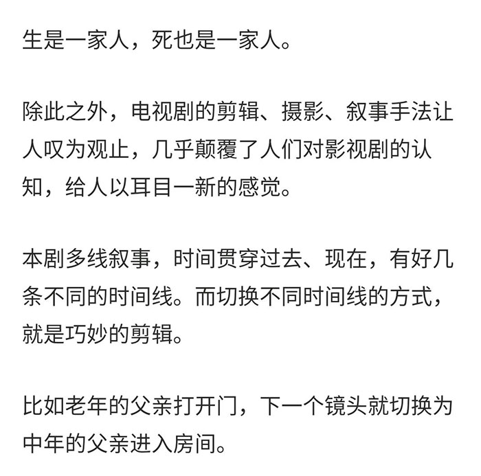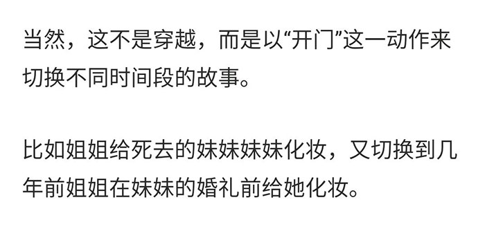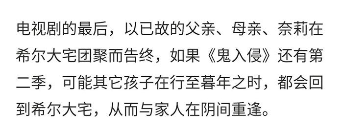 然后,在看到最后一集Nell说“our moments fall around us like rain,or snow,or comfetti……”,我想所有人都看出剧作者想在这里,总述他们为这个故事设计的非线性时空观。再后来我拉了一遍片(2020年1月四刷后修正),确认了这部剧想做的三件事,一是讲述一个完整的家庭故事,二是架构起独特的时空观,三是顺便解释一下“鬼”这个东西是什么。