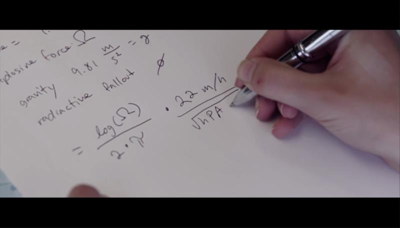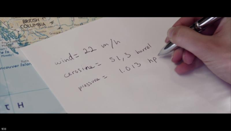 从三个镜头的左上角可以看出这三个部分是连起来的,刚好组成整个计算过程。先来看第一部分,我们注意到女二在第三行写下了等式:pressure=1.013hP……