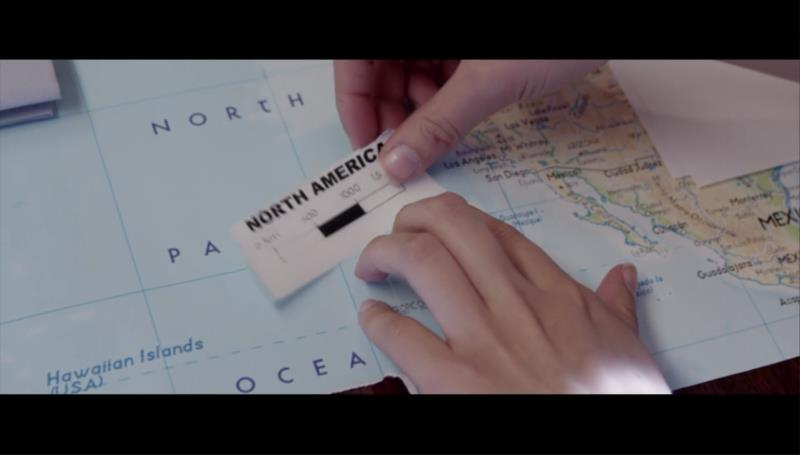 联系剧情我们可以推断这是他们现在的位置,他们要从这里飞往夏威夷,于是女二机智地撕下地图上的比例尺来了一套操作。