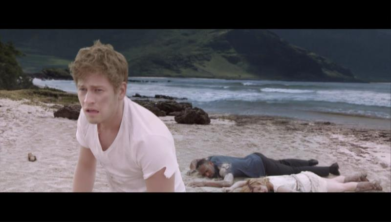 镜头一转,四个小青年居然安然无恙地被海浪冲到沙滩上趴着: