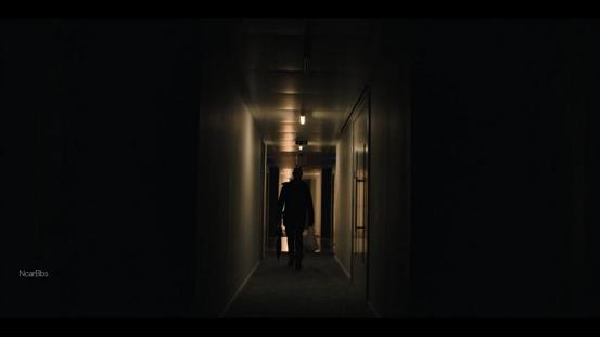 然后将工程师和杀手经过3个场景时的“声光反应”通过“监控视频”做对比,视觉失灵的诡异感一下子就出来了,这个时候自动开合的电梯门,一盏盏亮起的感应灯,越来越近的脚步声,都会产生巨大的压迫感,因为“监控里没人”。
