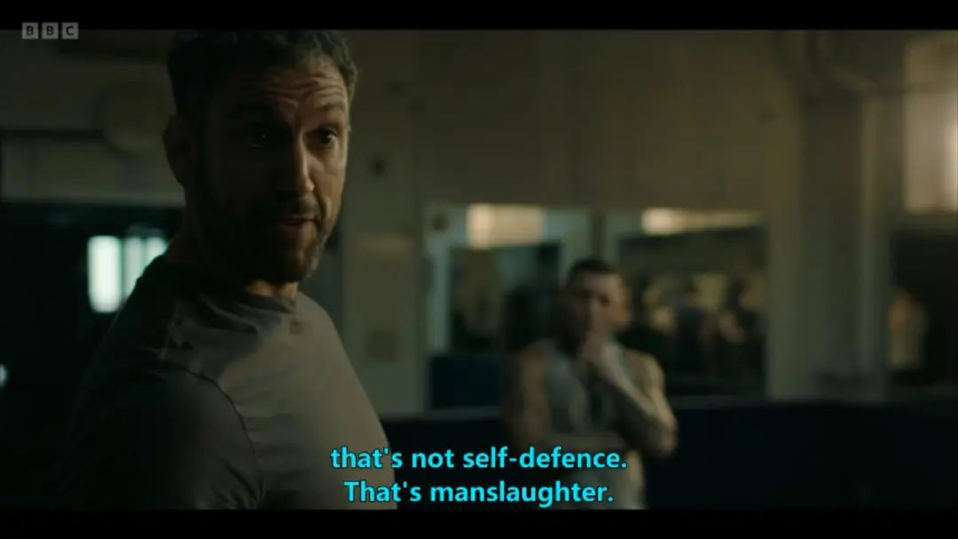 defence 防御,self-defence 自卫。manslaughter = man+slaughter 过失杀人。过失杀人罪虽然比谋杀罪轻,但属于刑事犯罪;而真正的正当防卫杀人则不是犯罪,女主攻击对方气管显然超过了自卫的范畴。