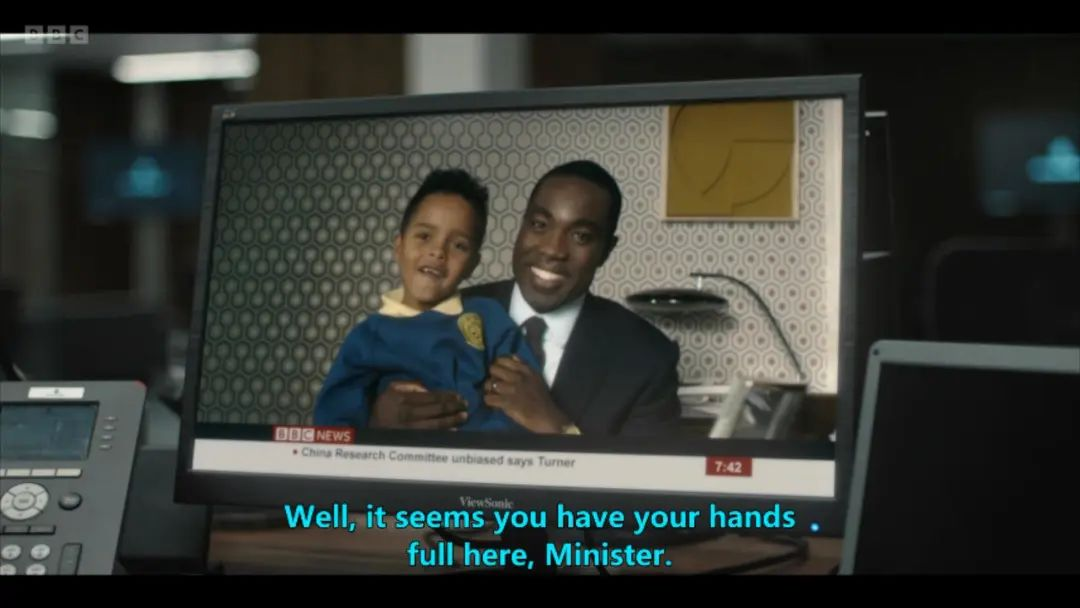 2.早晨,特纳在家中正准备出门,同时他在和两个人进行视频通话。他的两个孩子和妻子正在吃早餐。从对话中,我们得知,特纳是英国安全大臣,并且正在负责和中研委一起对中国企业的人脸识别系统进行评估。他家的电视是两位主播的节目,也是关于技术安全问题的讨论,特纳换了一根领带,接受直播采访,他的小儿子闯了进来,特纳没有赶走儿子,而是抱起他。(细节,这两位主播在后面会再次出现。)