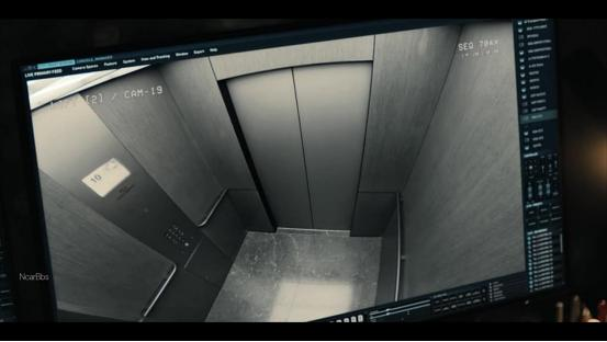 整个过程镜头给我们强调了三处场景,1公寓大厅,2电梯间,3楼道,重点突出工程师经过这些场景时,感应门、摄像头和感应灯的反应。