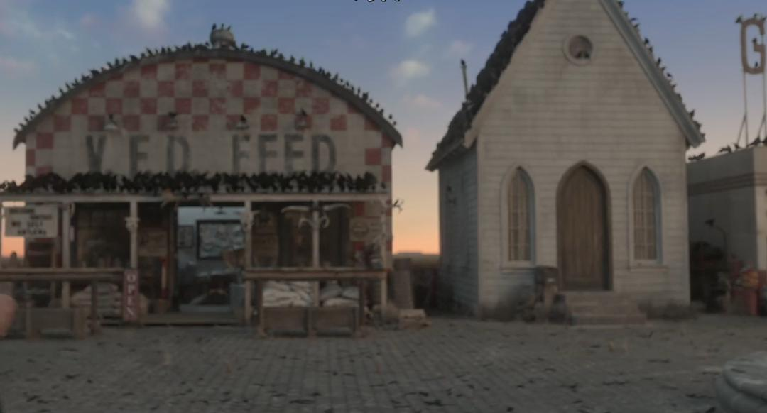 中间的图片,从左到右分别是:饲料店、教堂、加油站。