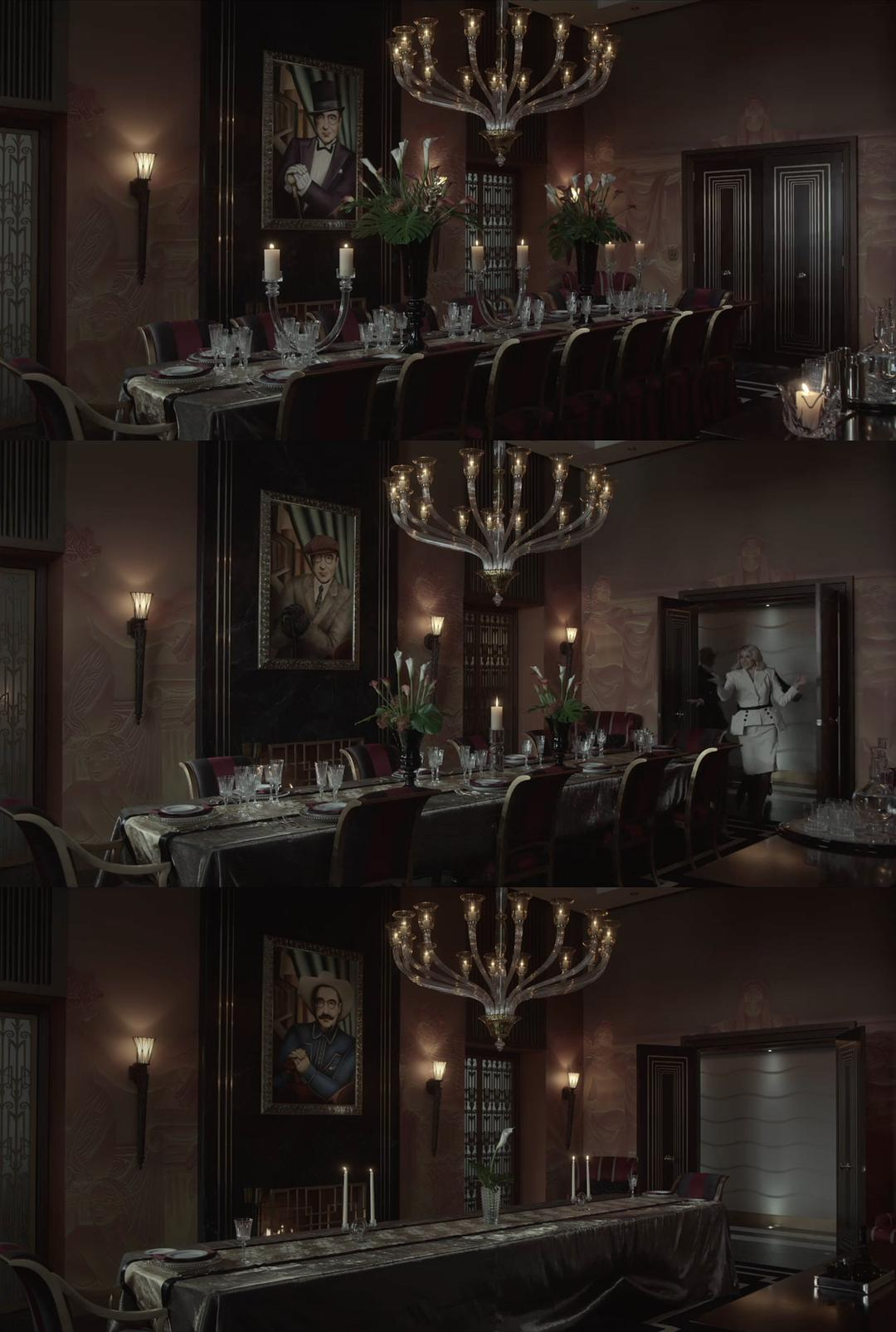 找不同:墙面的挂画不一样(画里是导演)。桌面摆放的餐具数量不一样。蜡烛数量不一样。插花数量不一样。椅子数量不一样。