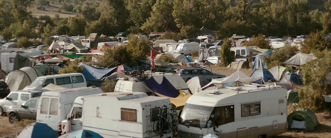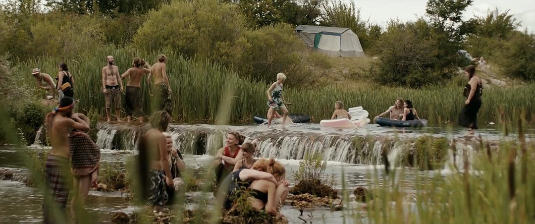 终于“天堂”在音乐节露天扎营处停下来。影片这里为观众重现了嬉皮士公社式流浪生活和超大规模露天音乐演:帐篷、篝火、室外烧烤、露天厕所、酒精、迷幻药、垃圾、反战呼声、震耳欲聋的音乐、头上插着象征爱与和平花朵的人们、彻夜无眠的舞蹈。