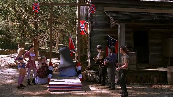 剧情方面就没什么好说的,毕竟无脑砍杀片,基本没什么剧情,只是大概介绍了下小镇起源于美国内部早起的南北战争,小镇居民都是战争下被北方军队虐杀的普通人。他们带着对北方人的恨意,一直以灵魂的状态存续着,并每年在被屠杀日举办庆祝活动,勾引北方游客来镇里并虐杀他们,名曰“复仇”。所以电影看似偏僻的食人族们杀人吃肉,实际上是鬼魂复仇捏!
