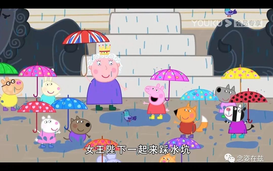 看得出剧作者们非常喜欢英国女王,女王几次出场,形象都极其正面。很威严,又很亲和,还屡次跟小朋友们一起跳泥坑。